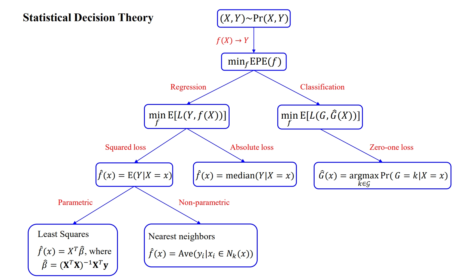 \[ EPE(f) = \mathbb{E}_X \mathbb{E}_{Y|X} ((Y - f(X))^2 | X) \]