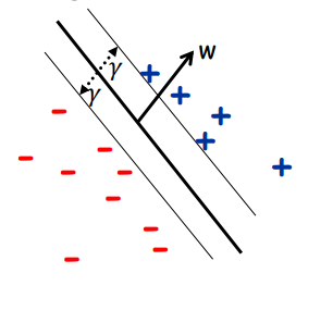 支持向量机试图找到一组最优的参数 \(\omega\) 并且使得能最大化间隔 \(\gamma\),对于所有的输入点\((x_i,y_i)\),满足: