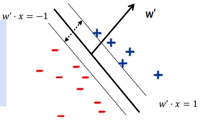 于是,问题从最大化问题被简化为了一个最小化问题:最小化 \(\|w'\|^2\),在此约束条件下:对所有的 \(i\)\(y_i (w' \cdot x_i) \ge 1\)